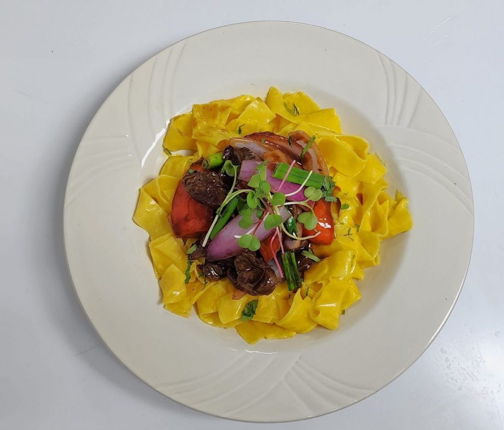 is an Italian pasta dish featuring wide noodles tossed with tender beef and a rich, savory sauce.